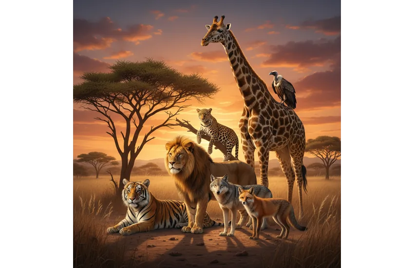 پسزمینه شامل درختهای آکاسیا، چمنهای بلند و آسمانی با رنگهای نارنجی و بنفش است که حس آرامش و شکوه طبیعت را منتقل میکند. این نوع تصویر در دستهی "تصویرسازی مفهومی" یا "Conceptual Illustration" قرار میگیرد، چون: - ترکیبی از حیوانات غیرهمزیست را در یک قاب نشان میدهد (مثل ببر و روباه کنار زرافه) - هدفش بیشتر انتقال پیام نمادین، زیباییشناسی یا تخیل است تا واقعگرایی علمی همچنین میتونیم بگیم این تصویر نوعی "Surreal Wildlife Composition" یا «ترکیب سوررئال از حیاتوحش» هست، چون: - حیوانات در موقعیتهای غیرواقعی قرار گرفتن (مثل پلنگ روی زرافه) - فضای تصویر حس خیالپردازی و هماهنگی غیرمنتظره