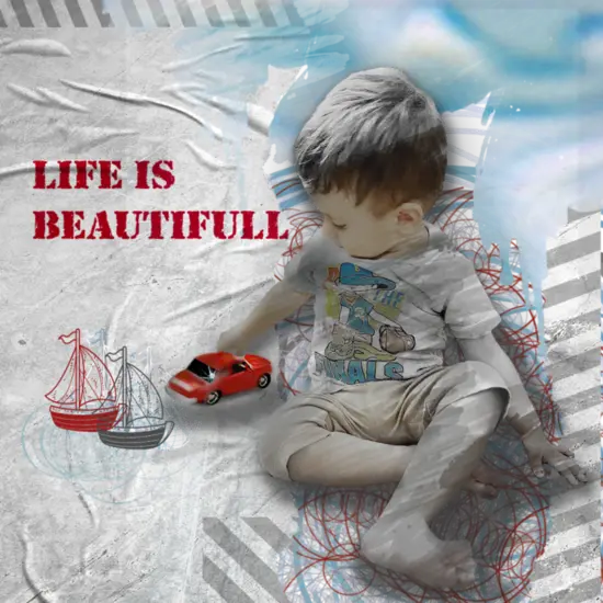 فتومونتاژ افکت دریا در صورت و دستهای کودک طراحی صفر تا صد بالش با حفظ بافت پارچه و تنظیم چروک و سایه روشن ان و افکت نهایی رنگ آبی بر روی آن تنظیم نور و سایه ها در کل صفحه بکگراند الهام از نقاشیهای ابستره کودکانه