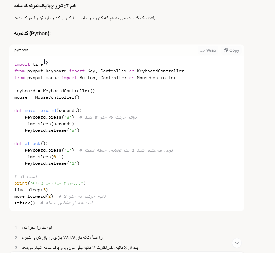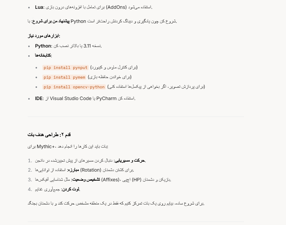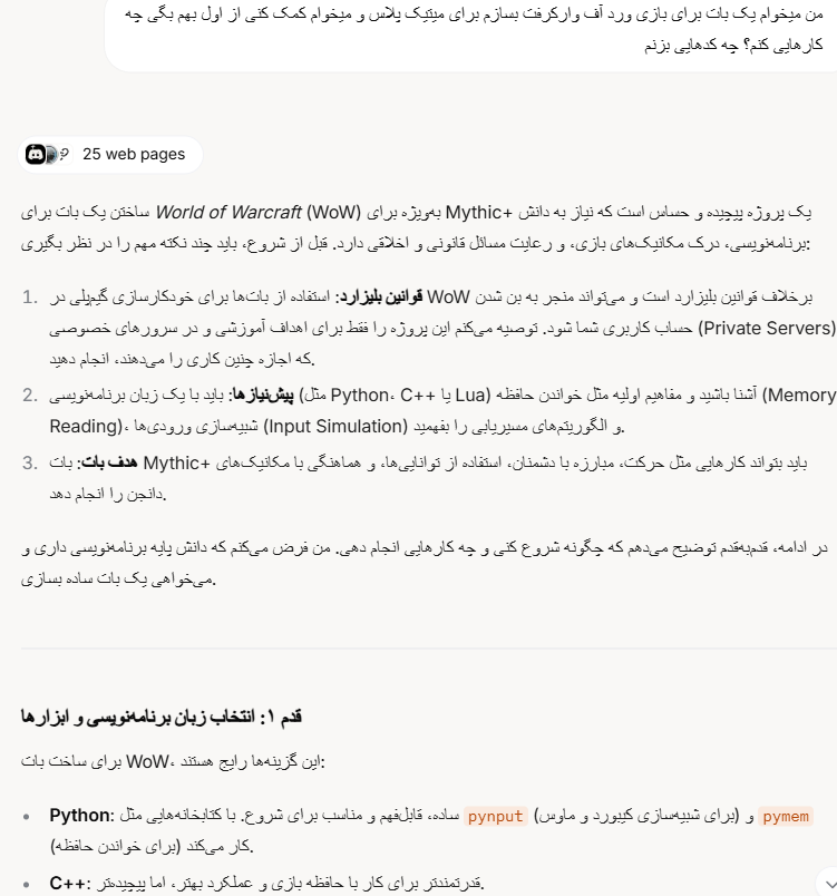 سلام! این چیزهایی هست که به صورت کلی هوش مصنوعی گفته از اونجایی که شما در قسمت بازی اطلاعاتی نداری اون قسمت را با هم حرف میزنیم و هر راهنمایی برای سرعت در کار انجام میدم مراحل کلی ساخت بات برای میتیک: 1. درک نیازها و هدف بات قبل از هر چیزی، باید مشخص کنی که باتت قراره چه کاری انجام بده. برای میتیک، ممکنه بخوای باتت کارهایی مثل مدیریت مکانیکها، هماهنگی با تیم، یا اتوماسیون یه سری وظایف خاص (مثل هیل کردن، دیپیاس زدن، یا جاخالی دادن از AoE) رو انجام بده. میتیکها معمولاً نیاز به دقت بالا و واکنش سریع دارن، پس باتت باید بتونه به تغییرات سریع محیط واکنش نشون بده. 2. انتخاب ابزار و زبان برنامهنویسی زبان برنامهنویسی: پایتون (Python) به خاطر سادگی و کتابخونههای زیادش (مثل PyAutoGUI یا OpenCV) گزینه خوبیه. البته Lua هم معمولاً برای اسکریپتنویسی در WoW استفاده میشه، چون ادانهای بازی با این زبان نوشته میشن. ابزارها: برای خوندن اطلاعات بازی (مثل موقعیت کاراکتر، مقدار HP، یا زمانبندی تواناییها)، نیاز به یه روش برای تعامل با بازی داری. این میتونه از طریق: Memory Reading: استفاده از ابزارهایی مثل Cheat Engine برای خوندن حافظه بازی. Pixel Detection: تشخیص رنگها و الگوهای روی صفحه (مثلاً برای شناسایی AoE). APIهای سرور خصوصی: اگه روی سرور خصوصی کار میکنی، ممکنه بتونی از API سرور استفاده کنی. 3. جمعآوری اطلاعات از بازی باید بتونی دادههای مهم رو از بازی بگیری، مثل: موقعیت کاراکترها (خودت و باس). وضعیت بوفها و دیبافها. زمانبندی تواناییها (Cooldowns). تشخیص مکانیکهای خاص میتیک (مثلاً انفجارها یا خطوط خطر). برای این کار، میتونی از ادانهایی مثل WeakAuras یا DBM استفاده کنی و باتت رو طوری تنظیم کنی که اعلانهای این ادانها رو بخونه. 4. نوشتن منطق بات باتت باید یه سری تصمیمگیری خودکار داشته باشه. مثلاً: اگه HP زیر 30% رفت، پotion استفاده کن. اگه باس یه AoE خاص زد، سریع جابهجا شو. اگه تانک مرد، یه نفر دیگه رو هدف بگیر و هیل کن. این منطق رو میتونی با شرطهای ساده (if/else) یا حتی الگوریتمهای پیچیدهتر (مثل یادگیری ماشین) پیادهسازی کنی. 5. اتوماسیون ورودیها برای کنترل کاراکتر، بات باید کیبورد و ماوس رو شبیهسازی کنه. توی پایتون، کتابخونههایی مثل pynput یا keyboard برای این کار عالی هستن. مثلاً: فشار دادن کلید "W" برای حرکت رو به جلو یا کلیک روی یه نقطه خاص از صفحه. 6. تست و بهینهسازی باتت رو توی محیطهای ساده (مثل دانجنهای معمولی) تست کن و کمکم برای میتیک بهینهاش کن. دقت کن که تاخیر (latency) و عملکرد سیستم روی سرعت واکنش بات تاثیر داره. 7. رعایت قوانین همونطور که گفتم، توی سرورهای رسمی بلیزارد، استفاده از بات ممنوعه. اگه میخوای فقط برای سرگرمی یا یادگیری این کار رو بکنی، سرورهای خصوصی (مثل AzerothCore یا TrinityCore) رو امتحان کن. این سرورها محیطی برای تست و توسعه دارن. یه مثال ساده با پایتون: فرض کن میخوای باتت وقتی HP کاراکترت کم شد، به طور خودکار یه Potion مصرف کنه: python Wrap Copy import pyautogui import time import keyboard # تابع برای چک کردن HP (فرضی - باید با ابزار واقعی جایگزین بشه) def check_hp(): # مثال: فرض میکنیم HP رو از رنگ یه نوار روی صفحه تشخیص میدیم hp_bar = pyautogui.pixel(100, 100) # مختصات نوار HP if hp_bar[0] < 50: # اگه رنگ قرمز شد return True return False # تابع برای استفاده از Potion def use_potion(): pyautogui.press("1") # فرض میکنیم Potion روی کلید 1 ست شده print("Potion استفاده شد!") # حلقه اصلی while True: if check_hp(): use_potion() time.sleep(0.5) # یه تاخیر کوچک برای جلوگیری از فشار روی CPU این فقط یه نمونه سادهست و برای کار واقعی باید مکانیزم تشخیص HP رو با Memory Reading یا ادانها جایگزین کنی. نکات اضافی: منابع: توی فرومهایی مثل OwnedCore یا GitHub پروژههای آماده برای بات WoW پیدا میشه که میتونی ازشون ایده بگیری. میتیکها: هر میتیک مکانیکهای خاص خودش رو داره. پس باتت باید برای هر باس جداگانه تنظیم بشه. اخلاقیات: اگه با تیم بازی میکنی، استفاده از بات ممکنه تجربه بقیه رو خراب کنه. بهتره فقط برای تست یا سرگرمی شخصی استفاده کنی.